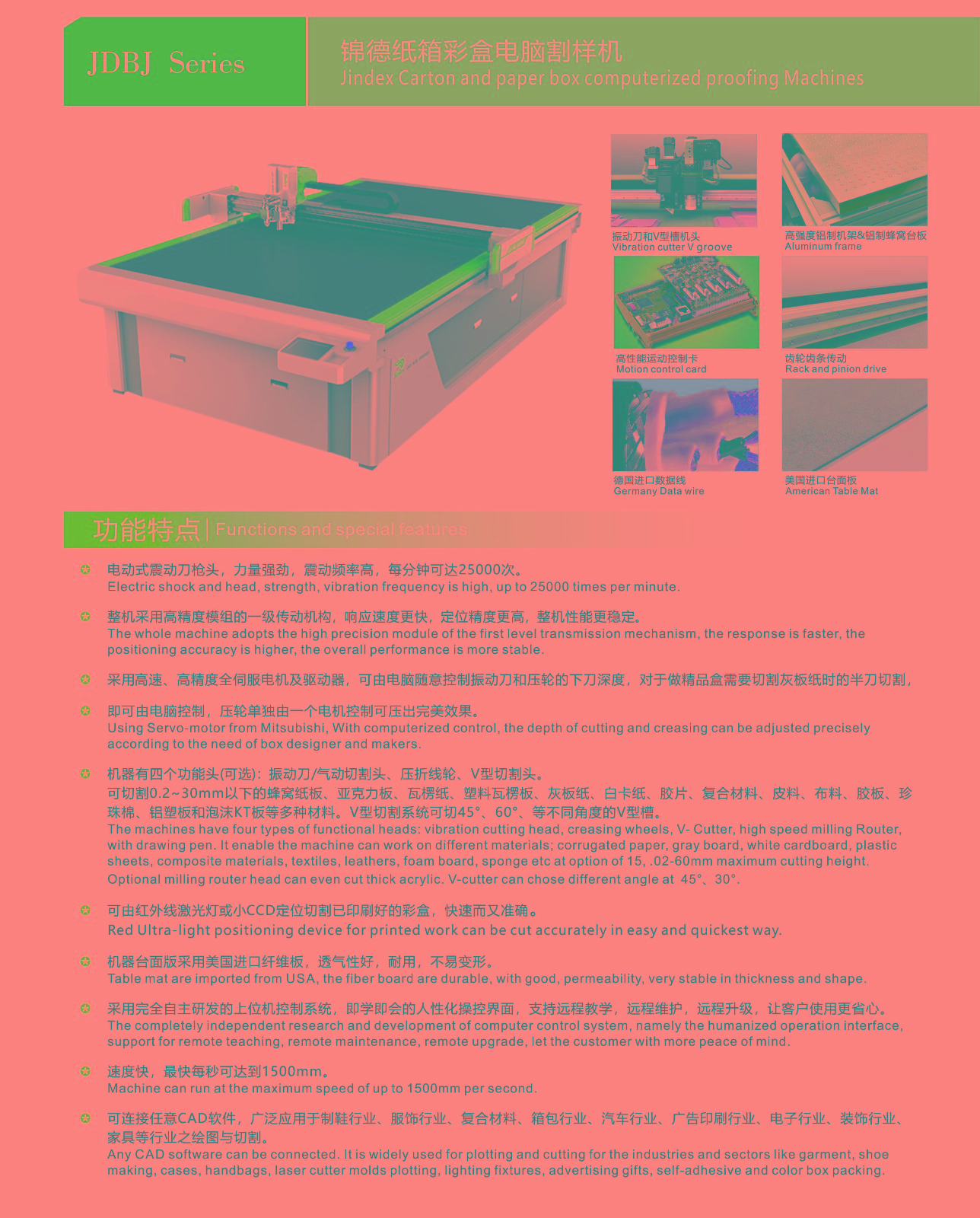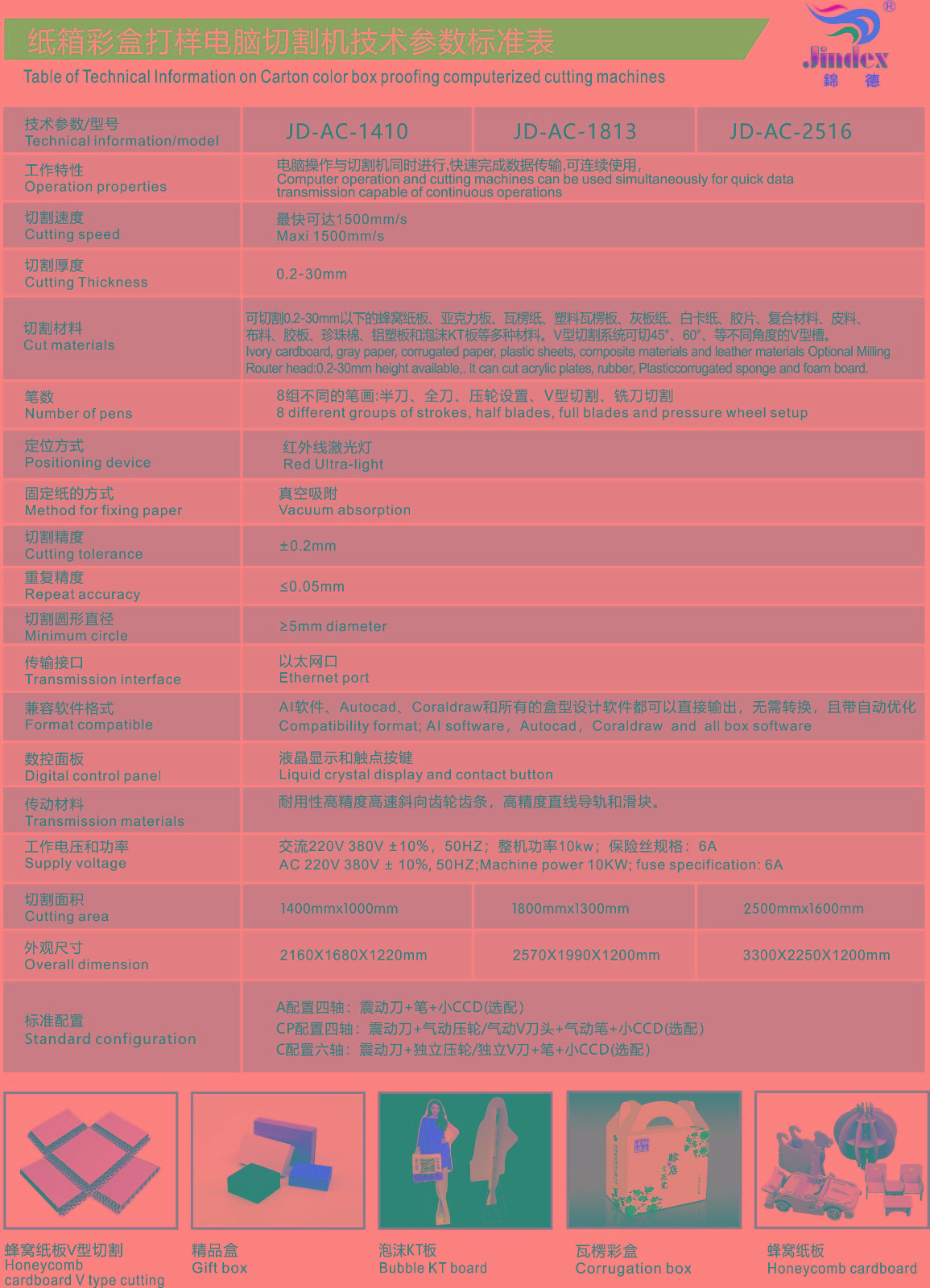錦德針對彩印包裝行業(yè)打樣及小批量定制生產而研發(fā)出的一款智能高速平板切割機,隨機配備振動刀、壓輪、拖刀、V切刀、泡沫刀等工具,不僅可輕松應對各種柔性材料,如瓦楞紙、蜂窩板、卡紙、泡沫、灰板、KT板等,還可切銑各種硬質塑料,如亞克力、PVC等。可廣泛應用于包裝、印刷、廣告、展示等行業(yè)。