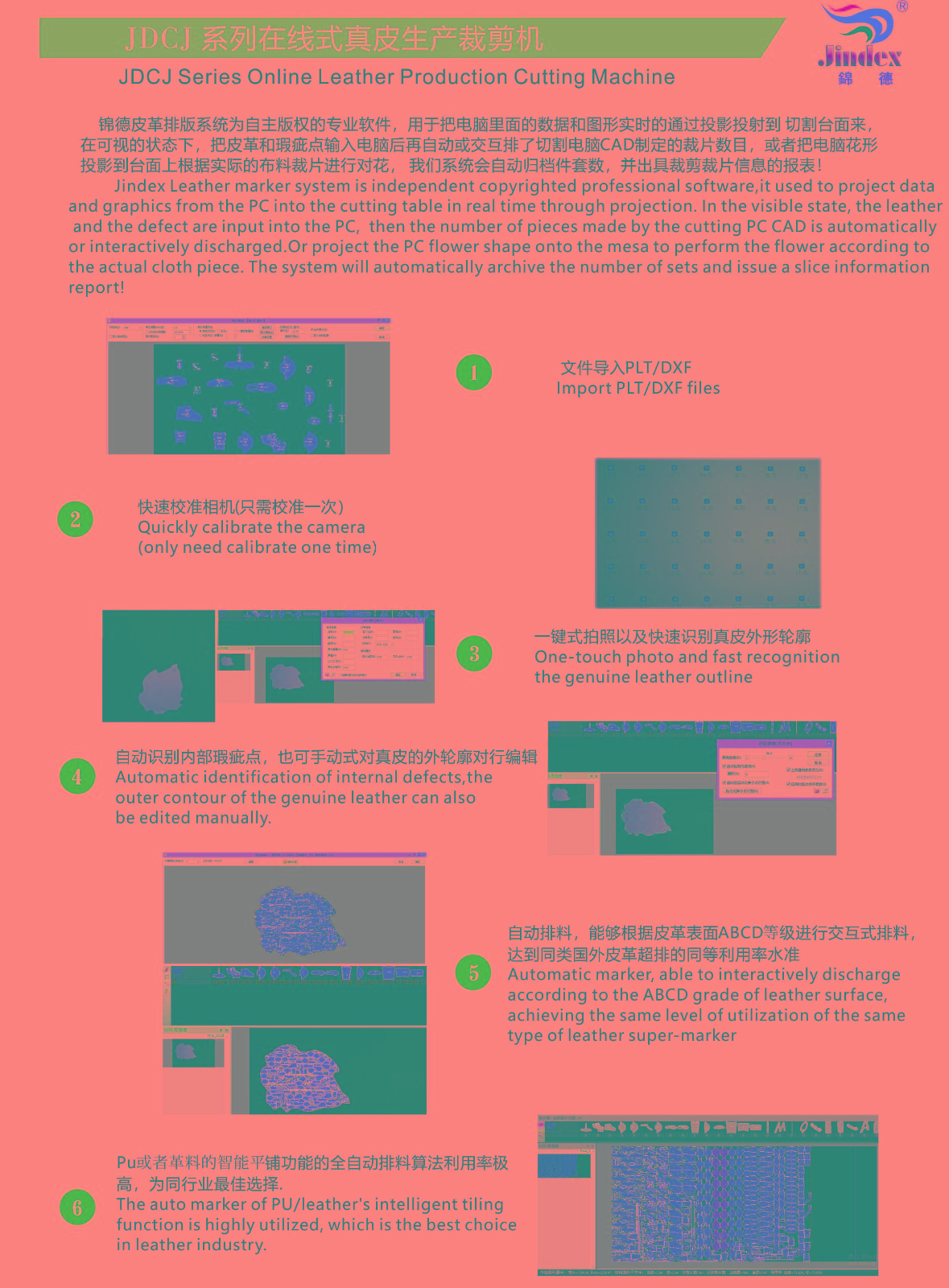 適用行業(yè):真皮座椅、真皮座套、真皮沙發(fā)、真皮箱包鞋業(yè)、真皮按摩椅等: 錦德全自動真皮裁剪流水線系統(tǒng)采用最先進的高清全彩真皮輪廓采集系統(tǒng),通過高精度掃描提取真皮不規(guī)則輪廓形狀、面積、瑕疵等信息,配合全自動排料系統(tǒng),產(chǎn)生最優(yōu)化的裁剪方案,獨特的三段式流水工作平臺,可以發(fā)揮最大裁剪效能,減少勞動強度,提升綜合使用能效,裁剪效能較傳統(tǒng)真皮裁剪設(shè)備提升120%以上。