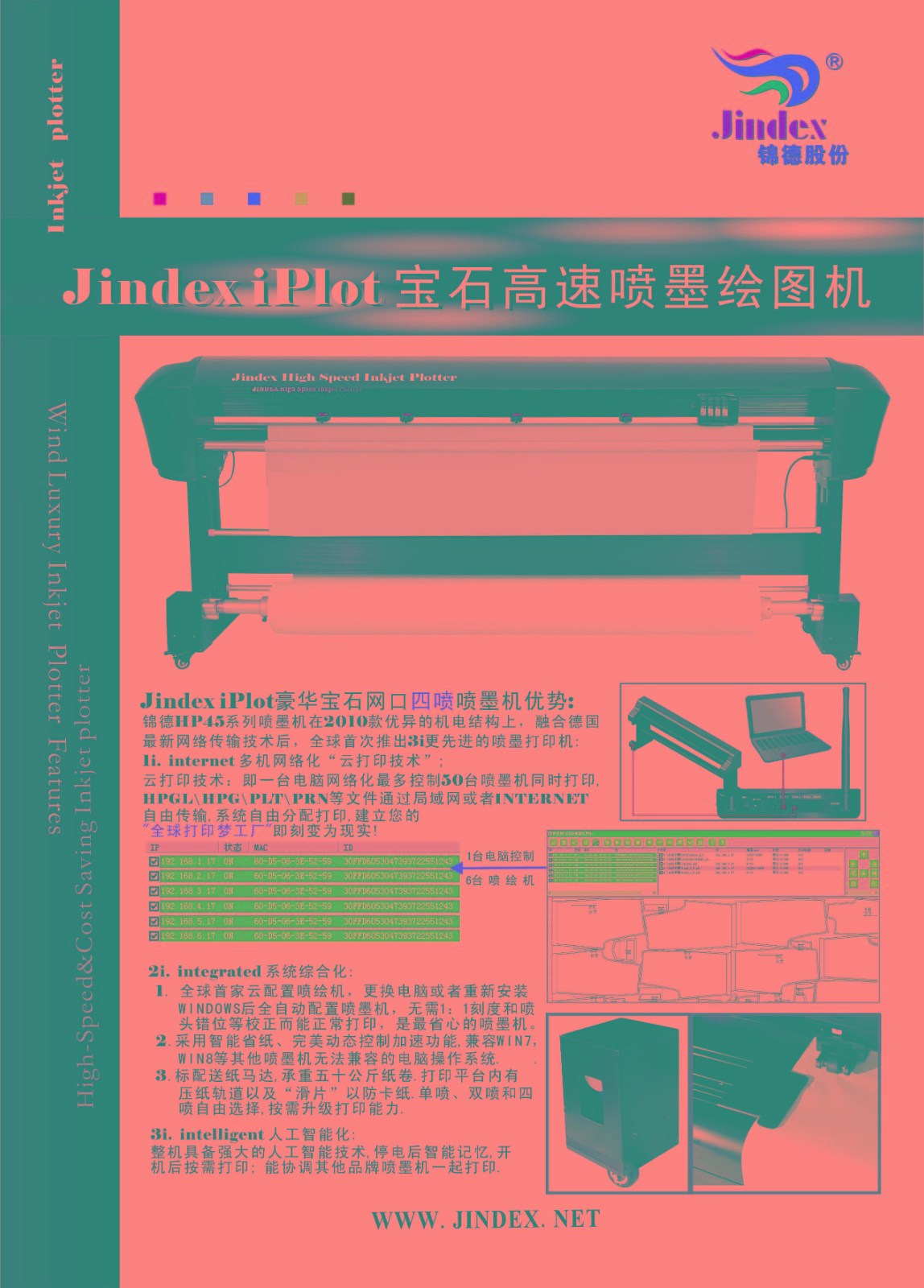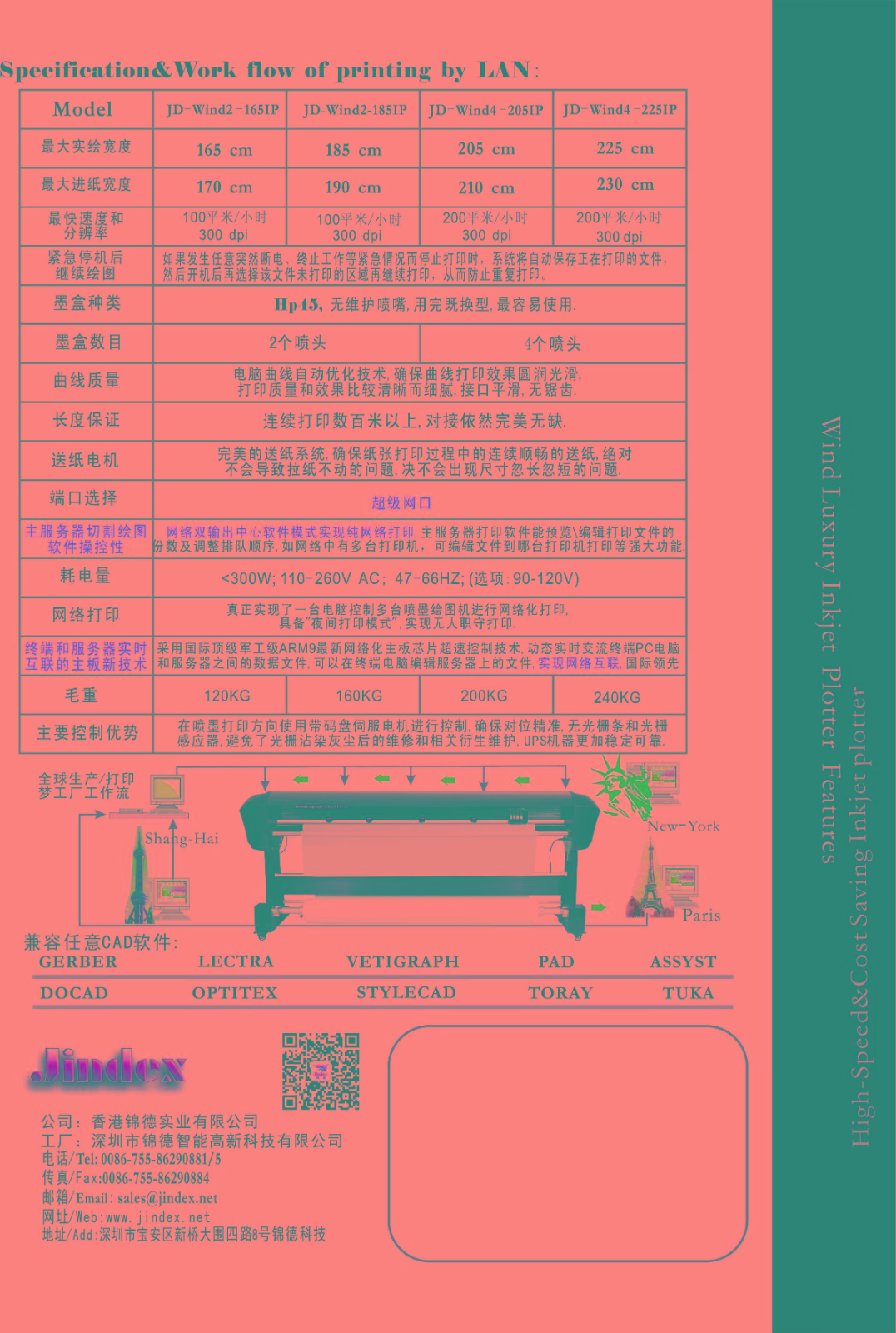 高速噴墨繪圖儀打樣效果清晰,性能穩(wěn)定,精確度達到國際標準; 標準機型雙噴墨,可升級4噴(比雙噴速度快1.5倍)